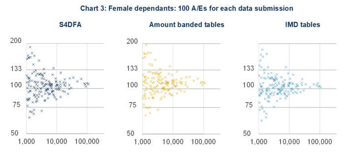 Our analysis highlighted some modelling limitations for female dependants – in particular, there are no female amount banded tables for members with small pensions, so we expect the amount banded tables results to appear heavy. The 'IMD tables' measure appears to provide a slightly better fit to actual experience than assigning all individuals to S4DFA.
