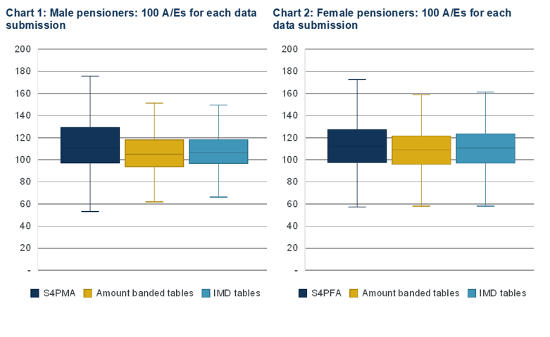 For male pensioners, the 'Amount banded tables' and 'IMD tables' measures are better predictors of actual mortality than the 'All' measure. Chart 1 below shows that the median 100 A/Es on these two measures for pension schemes with a reasonable quantity of data are closer to 100 than when assigning all members to S4PMA (111). Similarly, the interquartile ranges of the results are narrower.