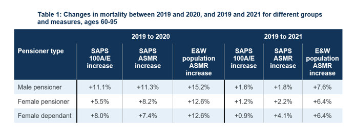 All three pensioner types experienced materially heavier mortality in 2020 than in 2019, and slightly heavier mortality in 2021 than in 2019. For both 2020 and 2021, all three groups saw a lower increase in 100A/Es and ASMRs than the increase in ASMRs for the general population (we note that 100A/Es and ASMRs are not directly comparable).