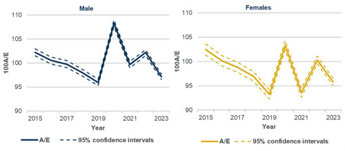 Experience by calendar year at an aggregate level for (non-enhanced) pension annuities in payment between 2015 and 2023 is shown in Chart 1. Experience between 2021 and 2023 has been volatile. At an overall level the mortality experience for 2023 (measured by comparing actual deaths with those expected under the “16” Series mortality tables for pension annuities in payment) is lower than 2022 but still above pre–pandemic levels, with interesting differences by gender.